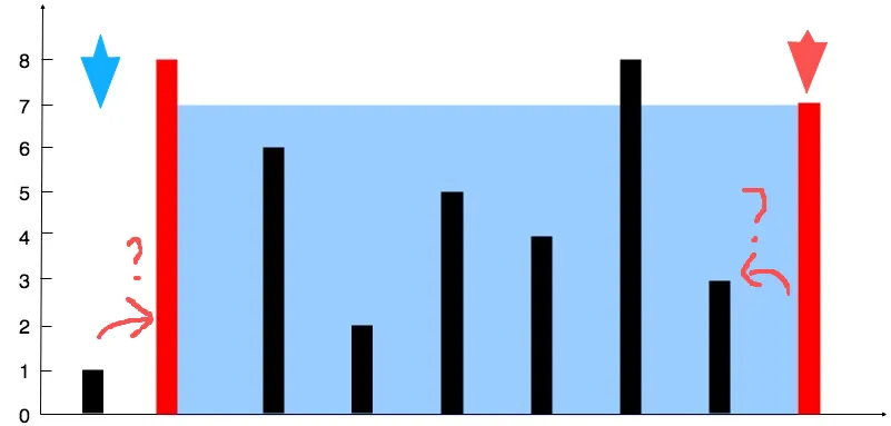 把两个指针分别放在最左端和最右端,我们一次挪动一步来找柱子,那么我们挪哪边的柱子呢?